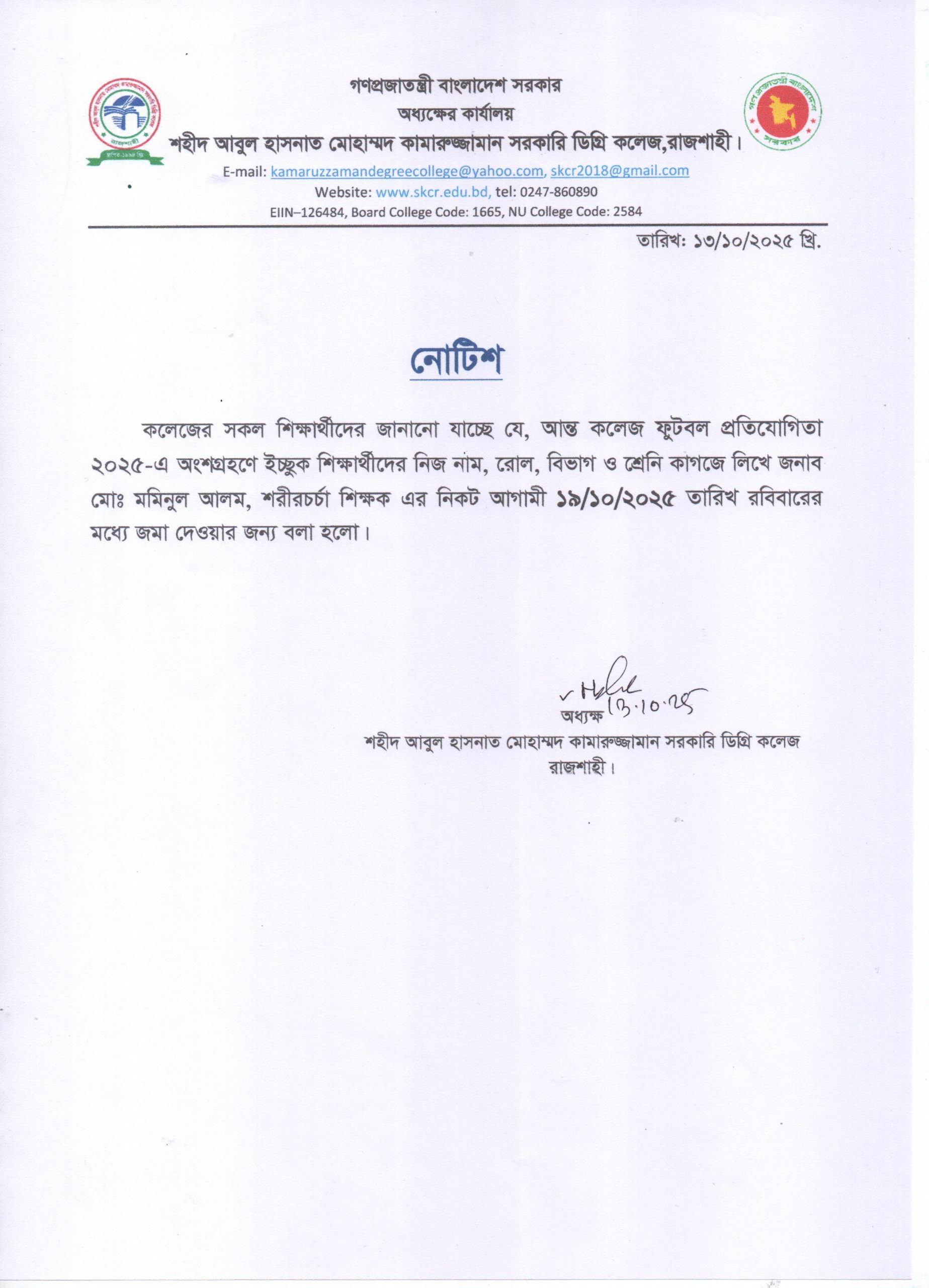 আন্ত কলেজ ফুটবল প্রতিযোগিতা ২০২৫ সংক্রান্ত নোটিশ।
