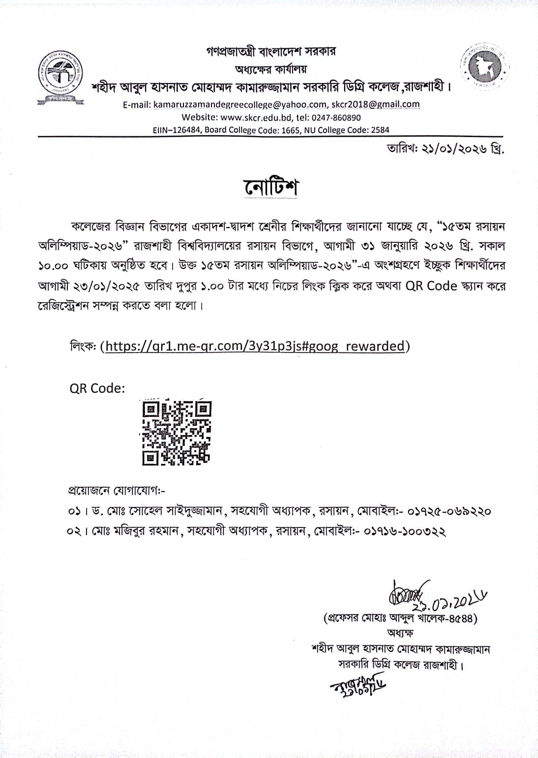 ১৫তম রসায়ন অলিম্পিয়াড-২০২৬ সংক্রান্ত নোটিশ।