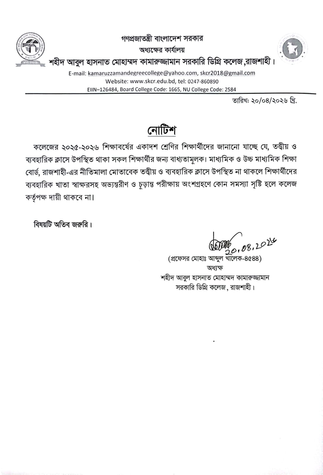 একাদশ শ্রেণির শিক্ষার্থীদের তত্ত্বীয় ও ব্যবহারিক ক্লাসে উপস্থিতি সংক্রান্ত জরুরি নোটিশ