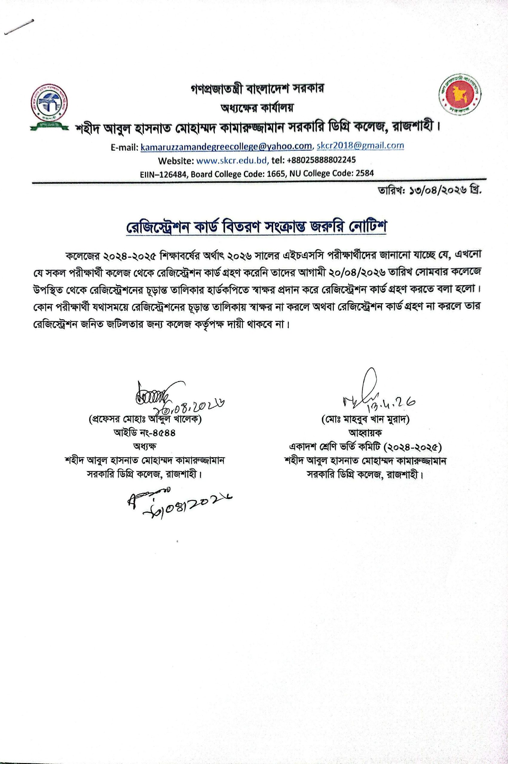 ২০২৪-২০২৫ শিক্ষাবর্ষের অর্থাৎ ২০২৬ সালের এইচএসসি পরীক্ষার্থীদের রেজিস্ট্রেশন কার্ড বিতরণ সংক্রান্ত জরুরি নোটিশ