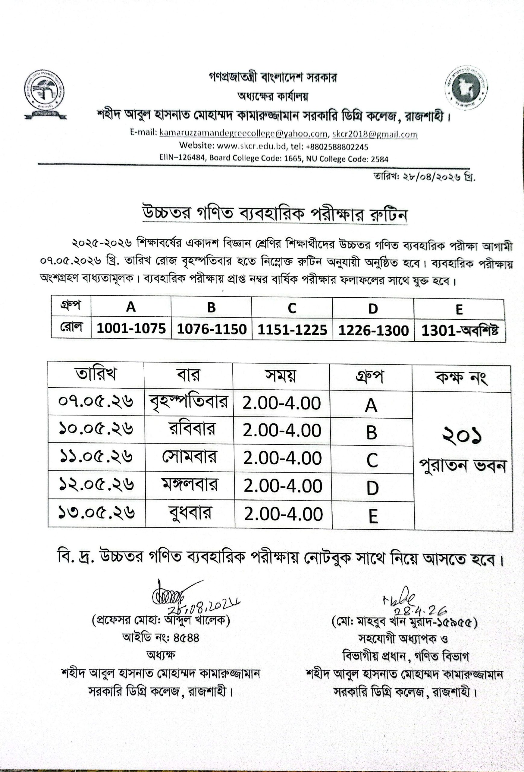 ২০২৫-২০২৬ শিক্ষাবর্ষের একাদশ শ্রেণির শিক্ষার্থীদের উচ্চতর গণিত ব্যবহারিক পরীক্ষার রুটিন